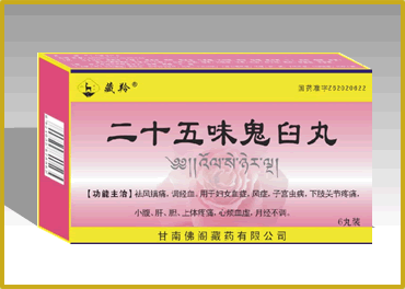 【主要成分】鬼臼,藏茜草,石榴子,藏紫草,肉桂,巴夏嘎,光明鹽,榜嘎,藏木香,訶子,熊膽,胡椒,喜馬拉雅紫茉莉,余甘子,花蛇肉(去毒),火硝,沙棘膏,沉香,朱砂,肉豆蔻,枸杞,紫草茸,芫荽果等二十五味中藥材。