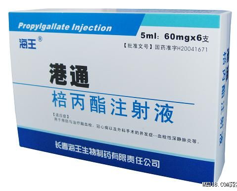 棓丙酯注射液 商品名:港通 5ml:60mg、10ml:120mg 6支/盒*600支/箱 5支/盒*400支/箱 腦血栓、冠心病以及外科手術后的并發(fā)癥 國藥準字:H20041671、H20041672 長春國奧藥業(yè)有限公司